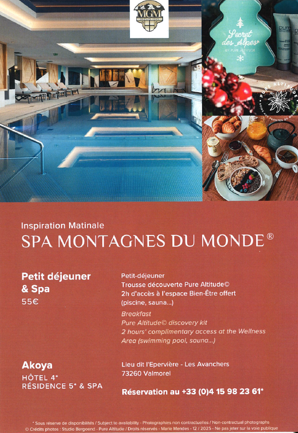 Pour tout renseignement supplémentaire, veuillez contacter directement le Spa Akoya et/ou consultez la carte des soins dans la partie "Contact".